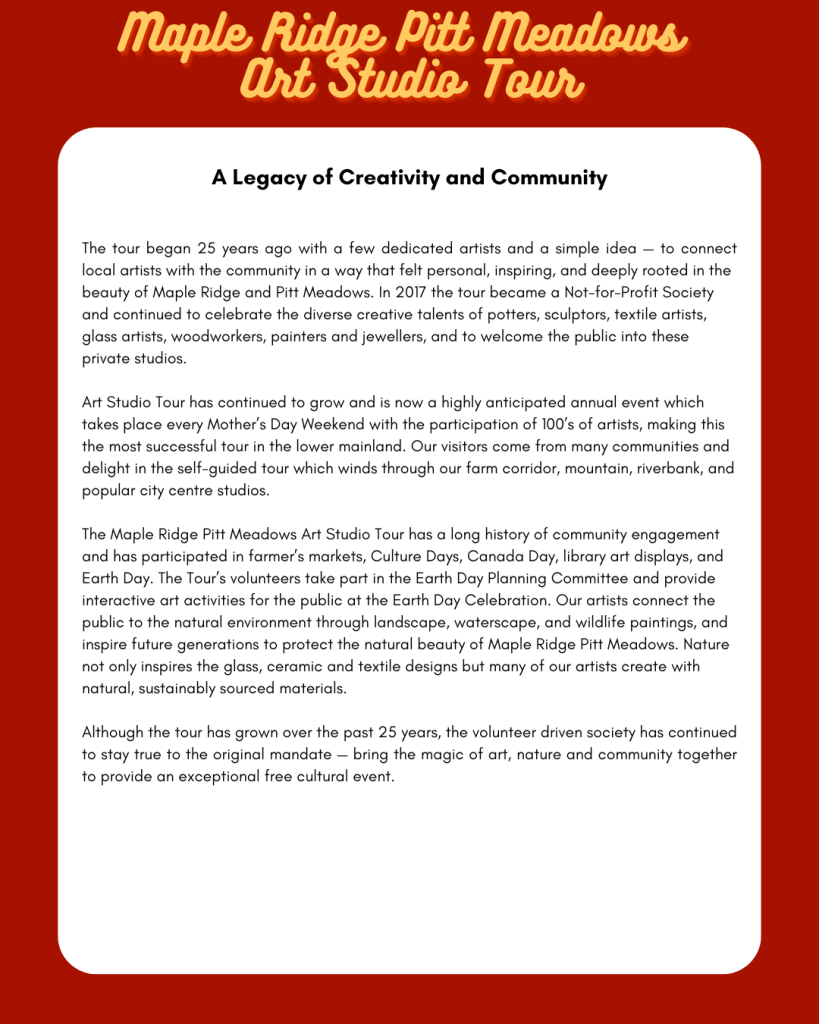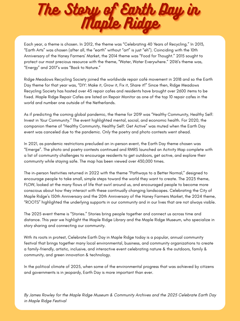 In 2025 Maple Ridge Museum created a temporary exhibit in partnership with the annual Earth Day celebration held in Memorial Peace Park on April 26, 2025. The 2025 Earth Day theme was Stories. Stories bring people together and connect us across time and distance. They can be told in so many ways – through music & dance, visual art & tattoos, oral & written traditions. The annual festival used this theme to weave together environmentalism, community, tradition, and performance.