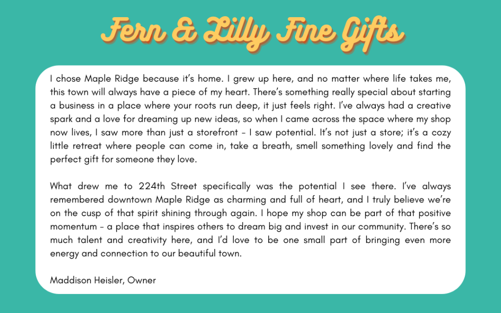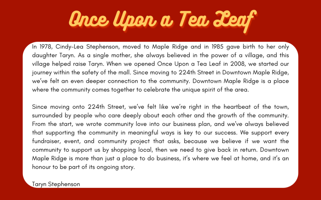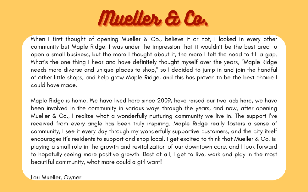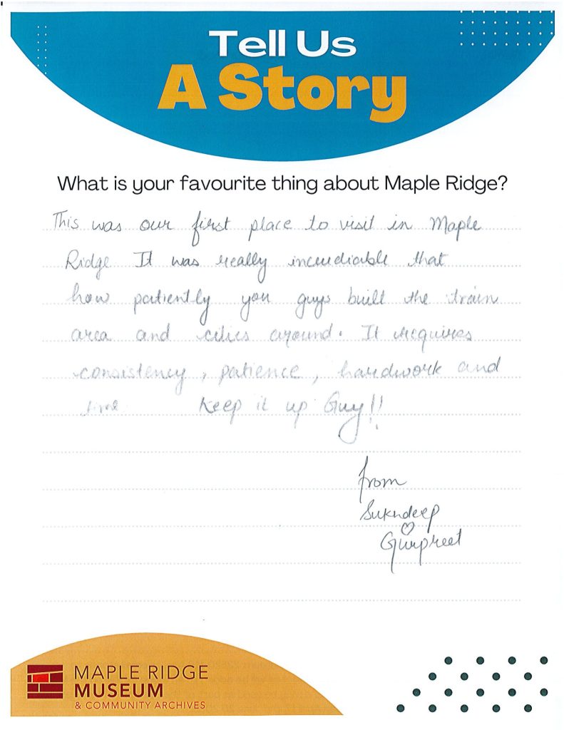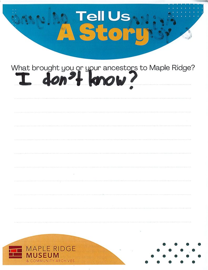 “As a community museum, stories are what we do. Our job is to preserve and celebrate the stories of Maple Ridge and its residents, whether their ancestors have been on this land since time immemorial, or if they moved here two months ago. We tell these stories through artifacts, exhibits, events, presentations, and social media. We use a mixture of tangible and intangible ways to explore Maple Ridge’s past and educate the public. We try to tell these stories from different perspectives so that the viewer or listener can share in that new perspective. In short, the stories we hear and tell help us care about each other and about the city we all share. We believe all stories are important, and the stories of Maple Ridge are what add richness to our community. That is how we learn from our past and inform our future.”