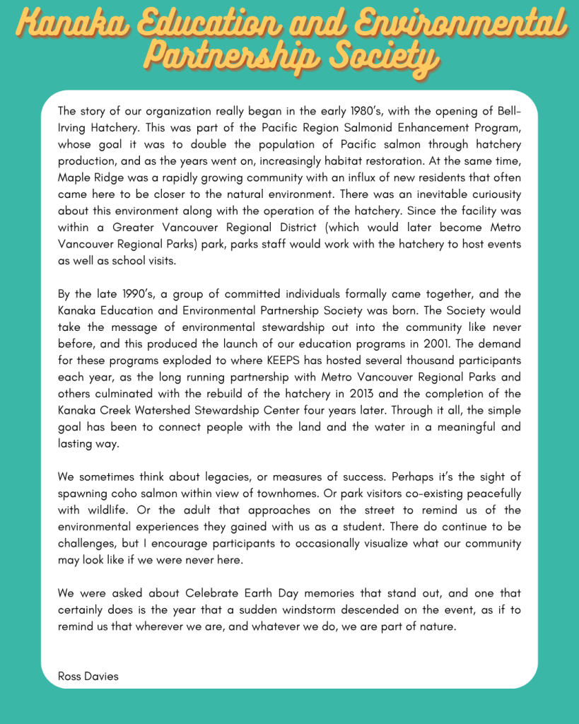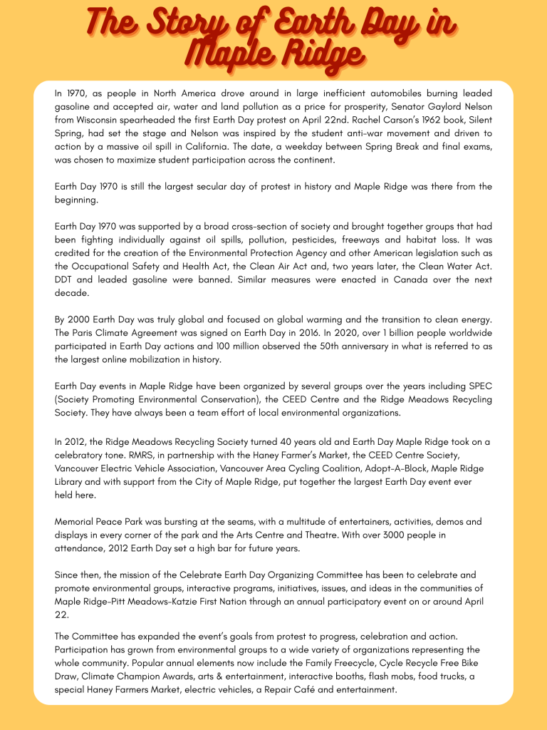 Thank you to Leanne Koehn for her tireless work in organizing the annual Earth Day festival in Maple Ridge. Thank you to James Rowley for collecting and editing the non-profit stories and writing the story of Earth Day. Thank you to the Maple Ridge Business Improvement Association for encouraging local businesses to contribute their stories. Lastly, thank you to everyone who contributed to this exhibit.