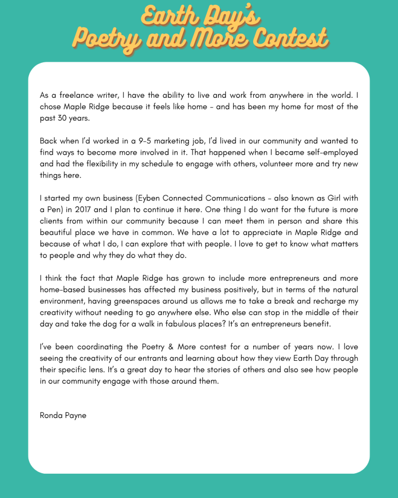 “Maple Ridge Public Library is delighted to celebrate Maple Ridge Earth Day 2025 at Memorial Peace Park on Saturday, April 26. This year’s theme, Stories, holds a special place in our hearts. Libraries are naturally home to countless stories—found in books, movies, music, and shared through our beloved programs like Babytime and Storytime. But stories are more than what’s on our shelves; they’re the threads of connection we weave within our community. From students and seniors to young families and newcomers, every library visitor brings their own story, enriching our shared narrative. Libraries are not just places to borrow or hear stories—they are spaces where people come together to create and live stories that celebrate the beauty of this city and its people.”