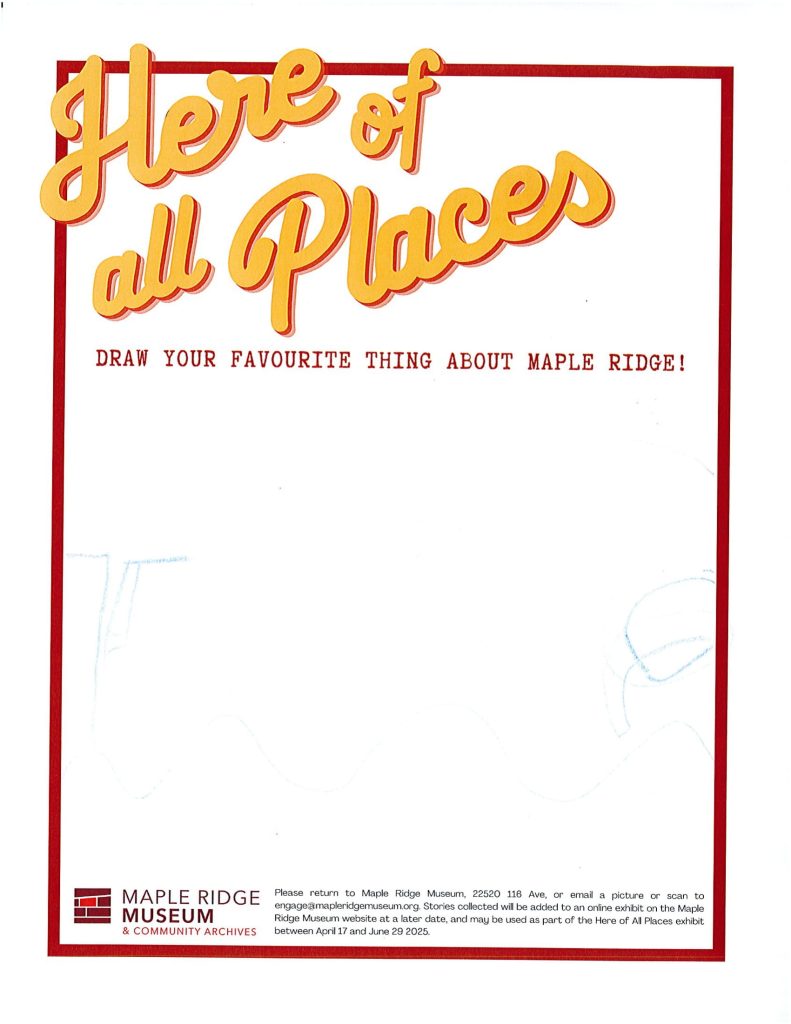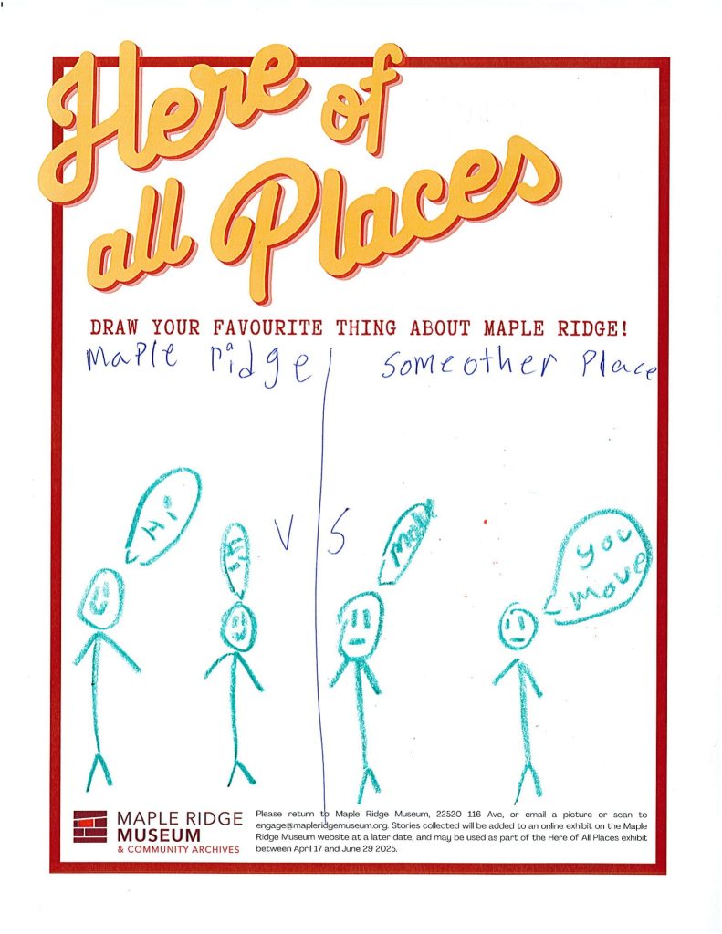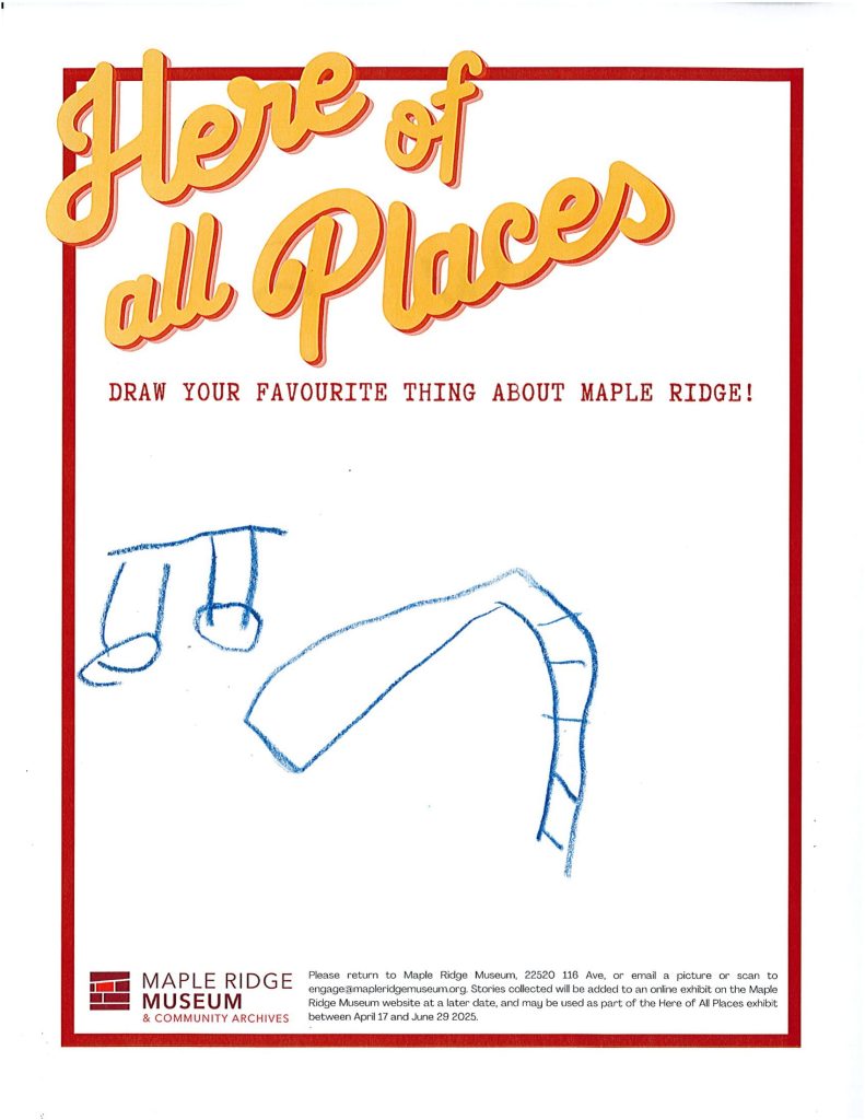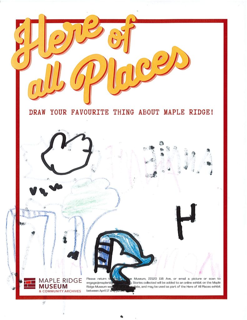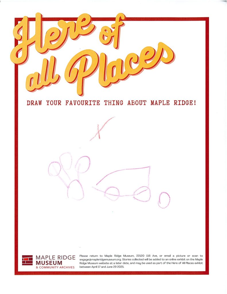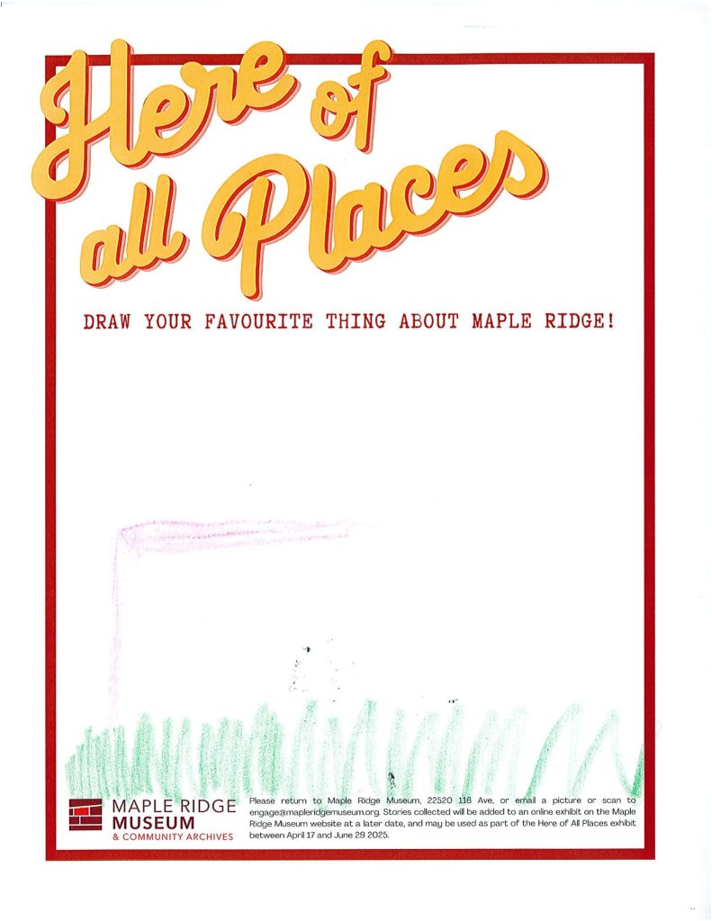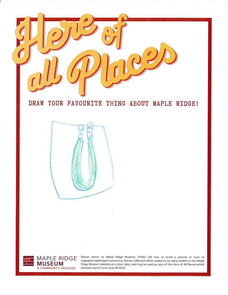 Prior to the festival, we launched the idea for this exhibit. Here of All Places asks the question, “Of all the places in the world, why is Maple Ridge your home?” Some Maple Ridge residents have ancestors who have lived on this land since time immemorial. Some residents moved here two months ago. All of them make up the community we have today. We asked residents, businesses, and community groups to share their own personal stories. This could be done in multiple ways. The physical exhibit had a recording device in the shape of a rotary phone where people could record their voices. We had handouts with prompts and space to write answers. We had handouts with space to draw a response. People could email us their story or comment on one of our social media posts. We promoted this exhibit at community events, including the Children and Family Resource Fair at the Maple Ridge Library, Pride in the Park, and of course Earth Day itself. In short, we tried to make story telling as accessible as possible.