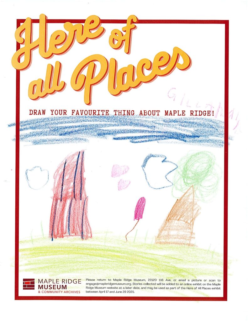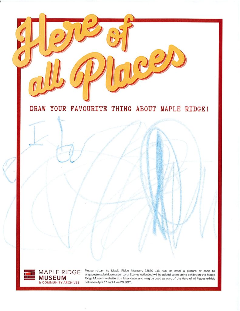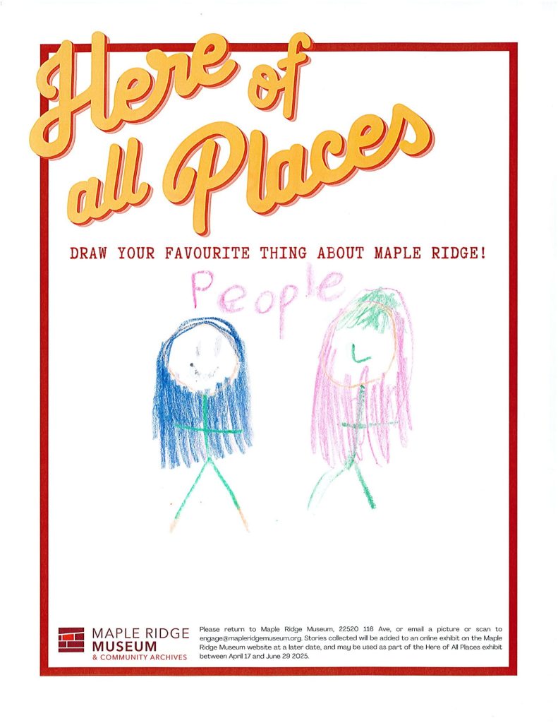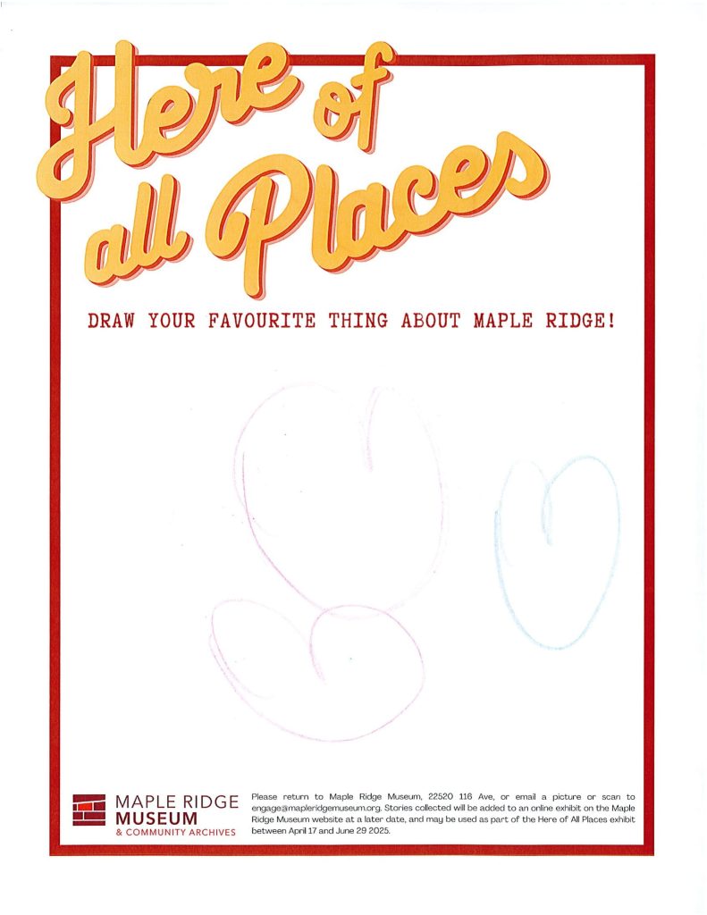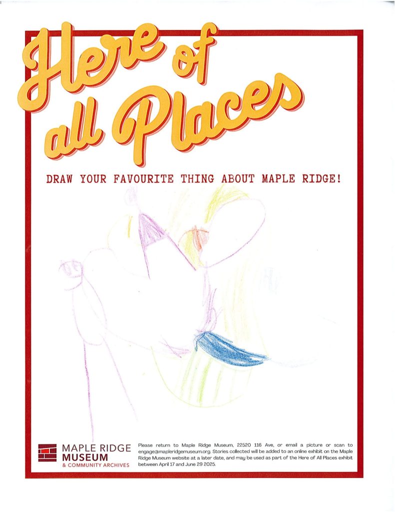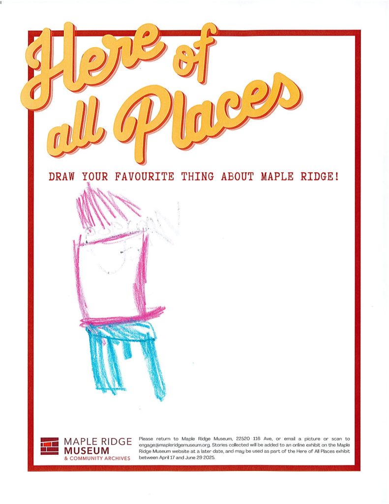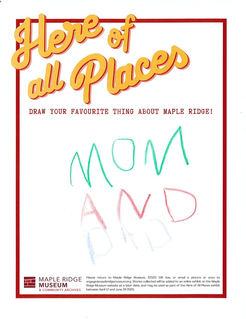 Prior to the festival, we launched the idea for this exhibit. Here of All Places asks the question, “Of all the places in the world, why is Maple Ridge your home?” Some Maple Ridge residents have ancestors who have lived on this land since time immemorial. Some residents moved here two months ago. All of them make up the community we have today. We asked residents, businesses, and community groups to share their own personal stories. This could be done in multiple ways. The physical exhibit had a recording device in the shape of a rotary phone where people could record their voices. We had handouts with prompts and space to write answers. We had handouts with space to draw a response. People could email us their story or comment on one of our social media posts. We promoted this exhibit at community events, including the Children and Family Resource Fair at the Maple Ridge Library, Pride in the Park, and of course Earth Day itself. In short, we tried to make story telling as accessible as possible.