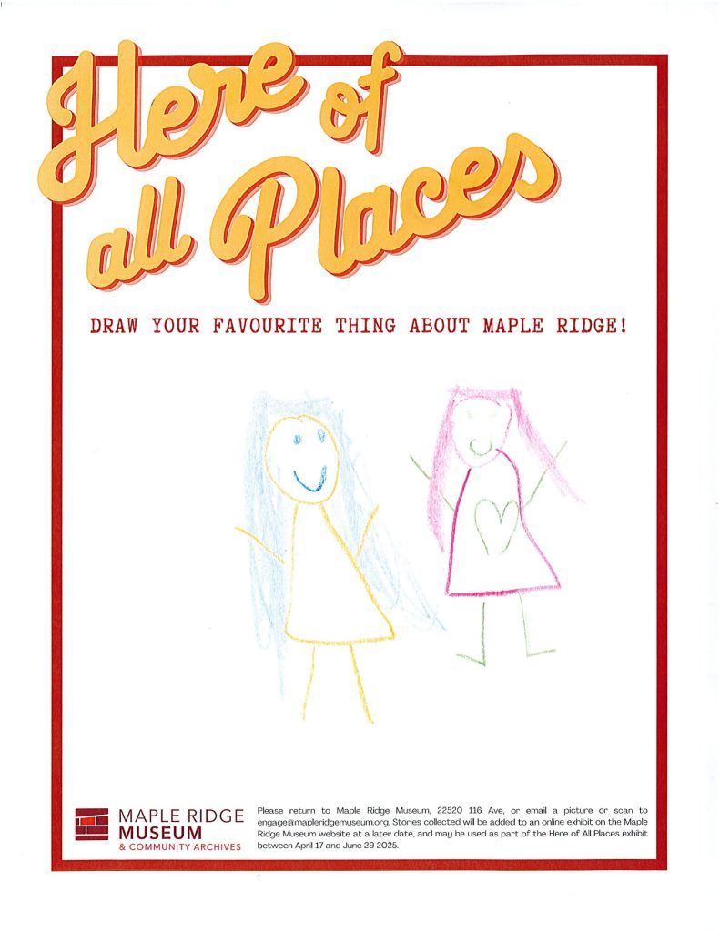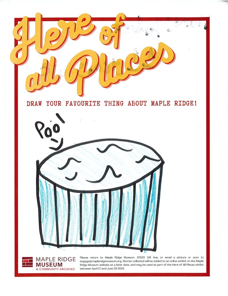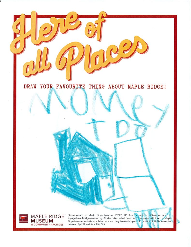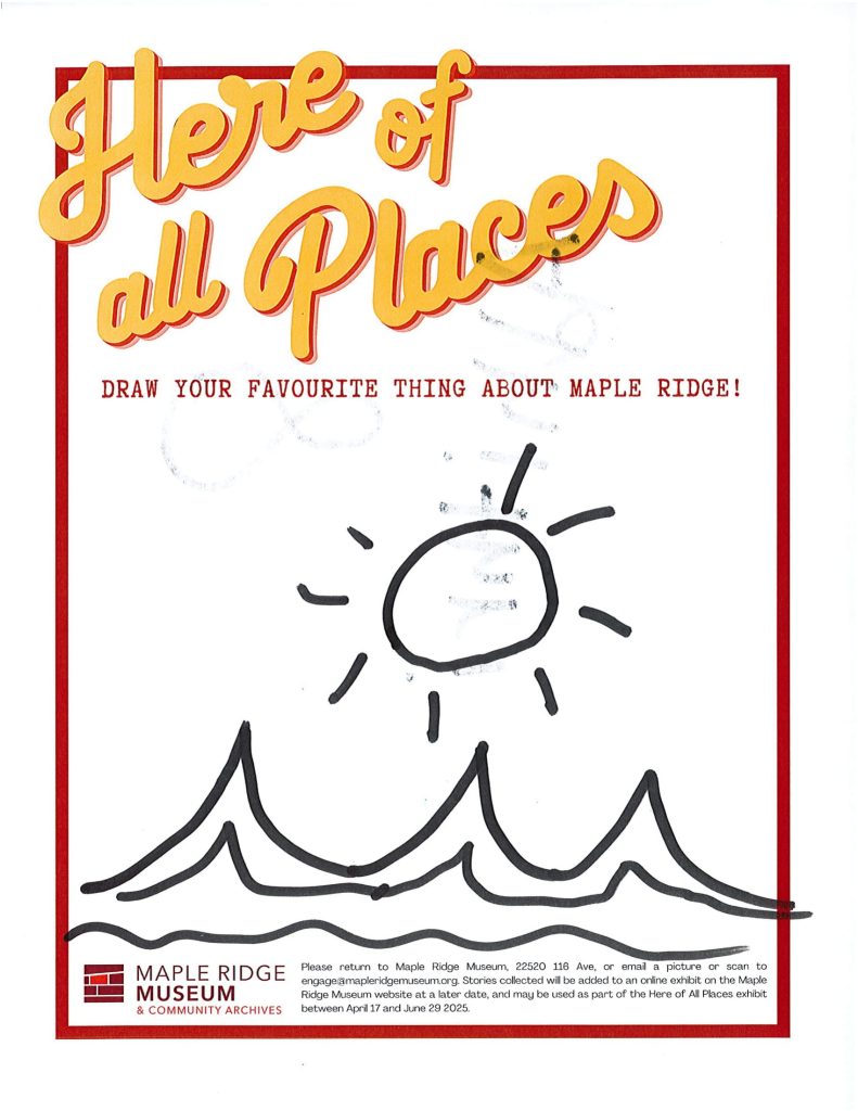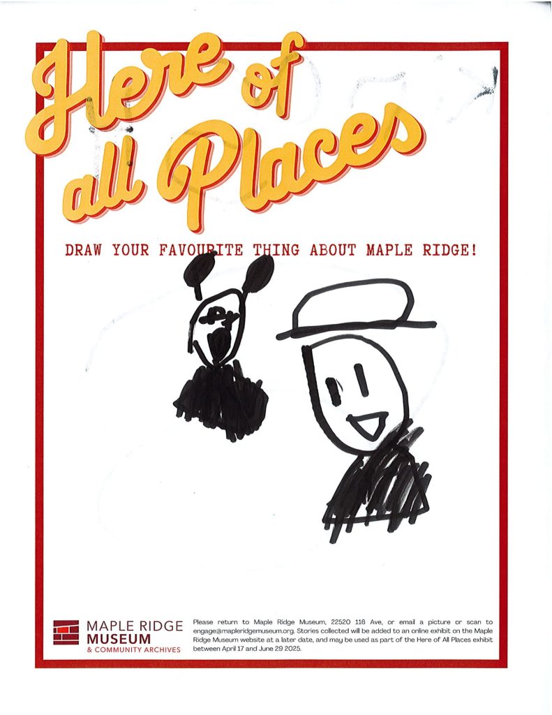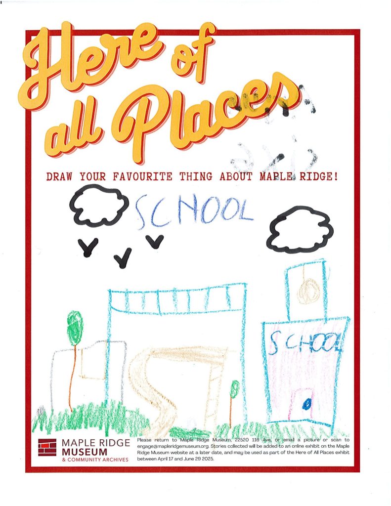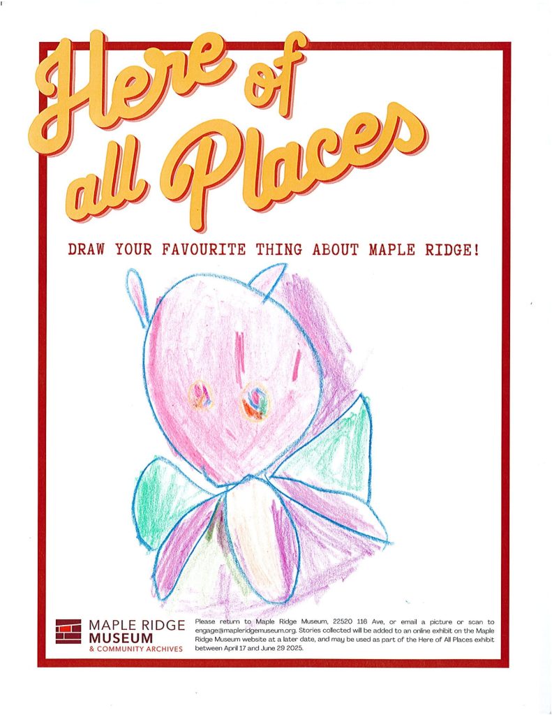 Prior to the festival, we launched the idea for this exhibit. Here of All Places asks the question, “Of all the places in the world, why is Maple Ridge your home?” Some Maple Ridge residents have ancestors who have lived on this land since time immemorial. Some residents moved here two months ago. All of them make up the community we have today. We asked residents, businesses, and community groups to share their own personal stories. This could be done in multiple ways. The physical exhibit had a recording device in the shape of a rotary phone where people could record their voices. We had handouts with prompts and space to write answers. We had handouts with space to draw a response. People could email us their story or comment on one of our social media posts. We promoted this exhibit at community events, including the Children and Family Resource Fair at the Maple Ridge Library, Pride in the Park, and of course Earth Day itself. In short, we tried to make story telling as accessible as possible.